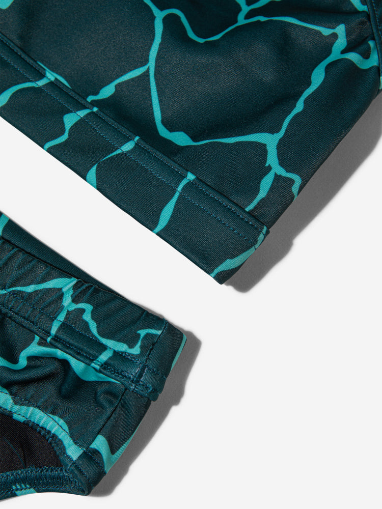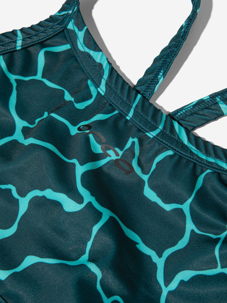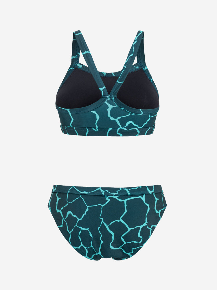 This two-piece swimsuit with wide straps is made with a compressive fabric for added support and comfort while swimming in the pool or in open water.